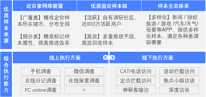 优质样本来源:一方面,品牌自有固定样本组拥有近800万活跃注册用户,覆盖百余城市提供广覆盖的调研支持;另一方面,近百家网络联盟以及多样化App合作生态圈,将为调研师生提供更细致、精准的样本条件。