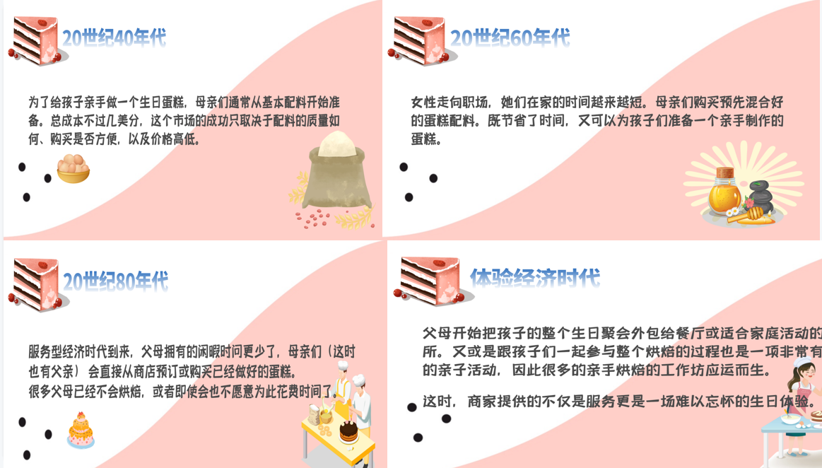 从一袋普通的面粉衍生成为一场以亲子体验为噱头的商业行为,虽然过程都是“做蛋糕”,但却经历了从初级产品到产品到服务到体验的层层蜕变。