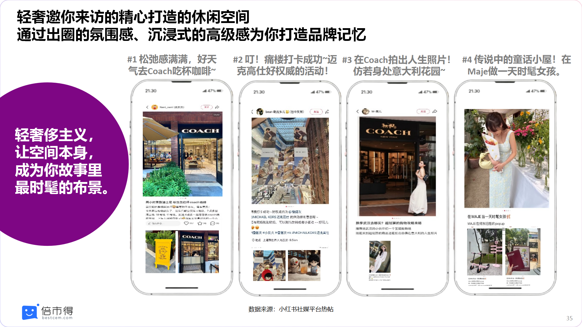 “塑造打卡空间” 成为新趋势。轻奢品牌在空间体验上的创新尤为突出,通过打造 “非交易性” 场景吸引年轻消费者。Coach 与高端餐饮跨界合作,推出 “香氛咖啡体验”,用户分享 “两小时乘地铁到迪士尼,就为了喝一杯 Coach 冰巧,松弛感拉满”;Maje 在历史建筑中开设快闪店,提供联名特调饮品和鲜花领取服务,打造 “童话小屋” 氛围,成为 “时髦女孩的打卡地”。这些空间的核心价值在于通过出圈的氛围感、沉浸式的高级感为消费者打造品牌记忆。