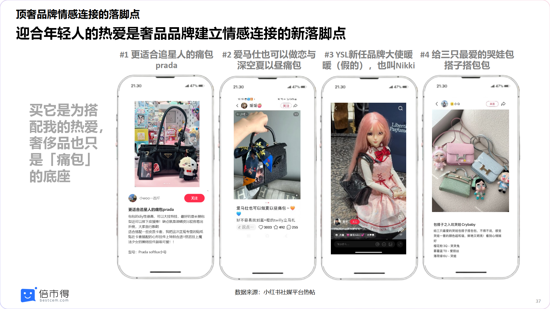 同时,“兴趣连接” 让奢侈品消费更具个性化。通过舆情分析可见,年轻消费者热衷于将奢侈品融入个人热爱的场景:将 Prada 包改造为追星 “痛包”、为潮玩搭配 Miu Miu 包包、用爱马仕丝巾制作痛包等分享,在社交媒体引发大量传播。这类内容打破了奢侈品 “高冷” 的固有形象,使其成为表达个人兴趣的 “载体”,相关话题下的用户互动率显著高于常规奢侈品展示类内容。