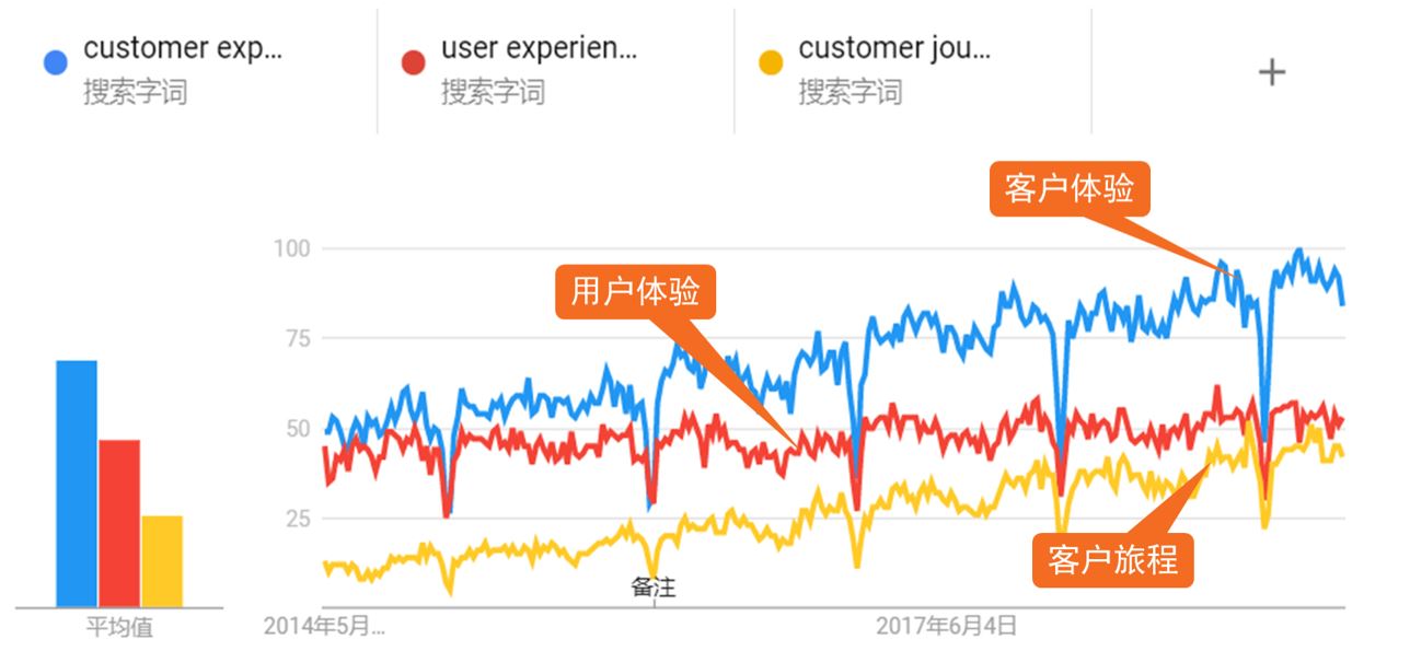 在全球领域对这几个关键词的关注度,蓝色是客户体验,红色是用户体验,橙色的是客户旅程。刚开始客户体验和用户体验同一水平,五年以后关注多触点的客户体验是用户体验的一倍。客户旅程以前是0,现在已经赶上用户体验的搜索量了。