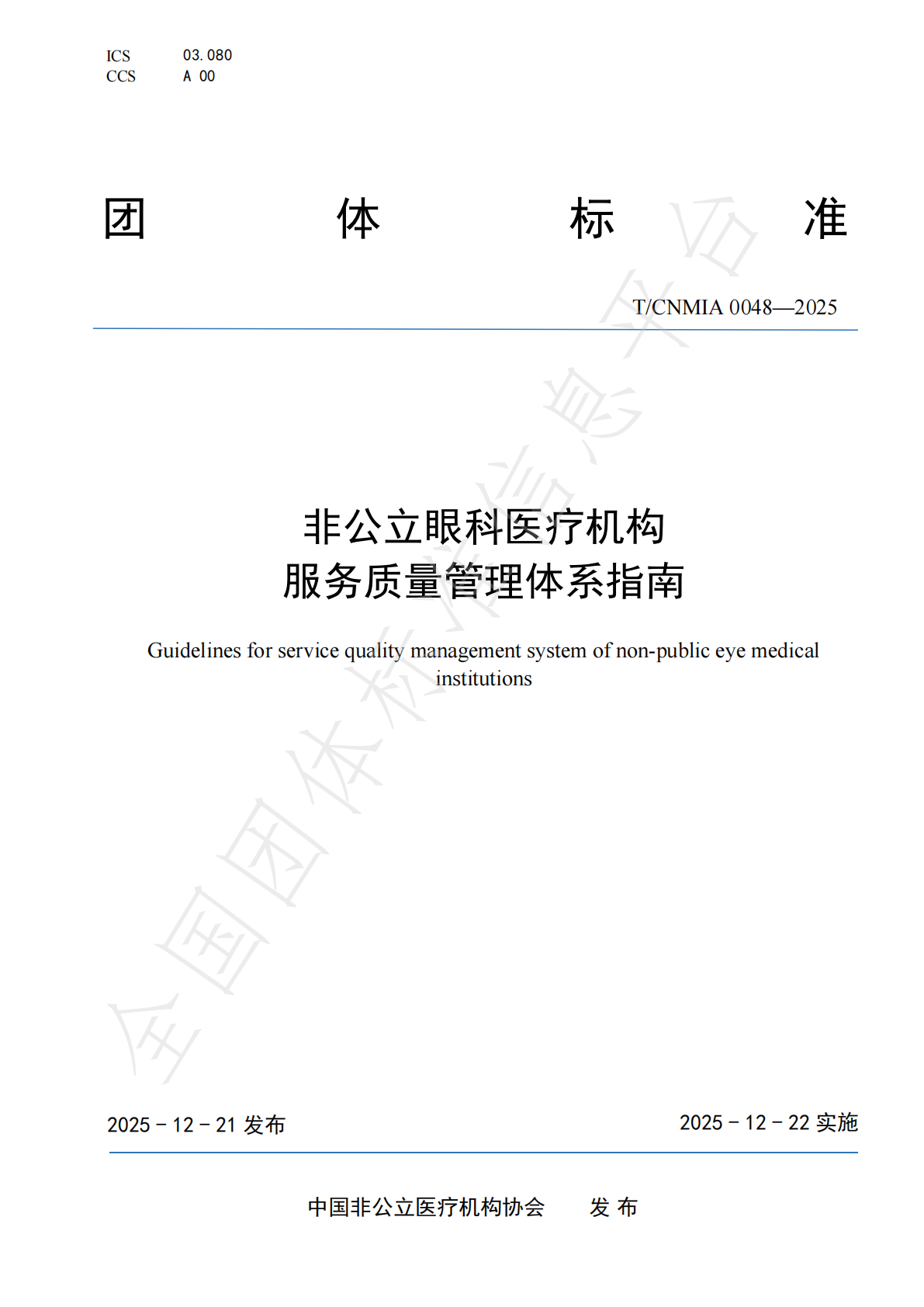 近日,由华厦眼科医院集团牵头,中国非公立医疗机构协会医院管理分会、众言科技等多单位联合起草的团体标准《非公立眼科医疗机构服务质量管理体系指南》(T/CNMIA 0048-2025)正式发布,于2025年12月22日起正式实施。该标准的出台,为全国非公立眼科医疗机构(包括眼科医院、门诊部、诊所等)提供了系统性的服务质量管理指南。