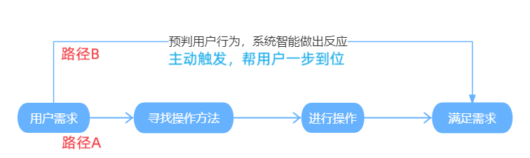 用户产生意图,若让用户自己去摸索方法、进行操作、实现目标,会落于下乘(路径A)。最好预判用户行为,系统智能做出反应,帮用户一步到位(路径B)。
