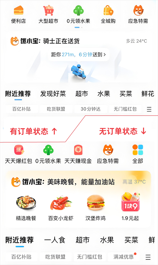 以外卖场景为例,当用户有外卖订单时,最高频查看的信息应该就是外卖的配送情况。该场景中,首页前置展示配送信息,让用户高效获得即时信息,避免焦虑,也省去前往订单页查看配送状态的繁琐操作。