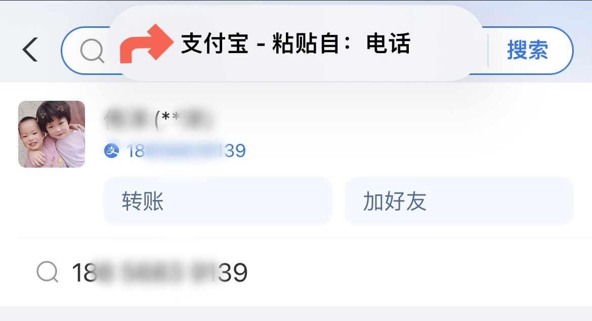再如,当用户复制了一串电话号码后,打开支付宝使用搜索/转账功能,支付宝会询问用户是否直接搜索/转账给复制的号码,只需一次点击即可完成操作。这些都是通过快捷导入,提高效率并确保信息填写的准确度。