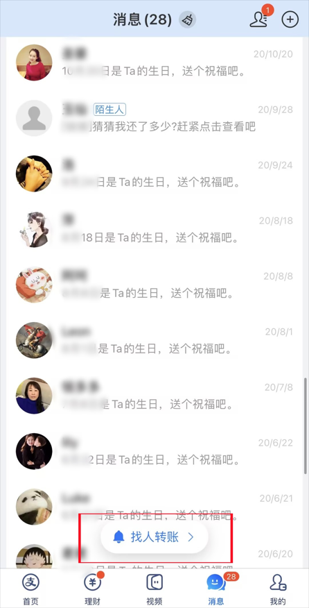 用户在支付宝消息列表中滑动浏览多屏后,会出现“找人转账”的提示,点击后进入朋友列表的纯净模式,去掉服务通知等跟转账无用的列表,提高了用户的寻找效率。