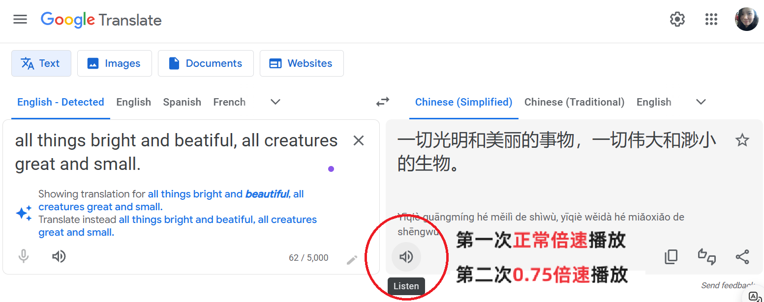 在网页版的谷歌翻译里,第一次语音播放是正常速度,而当用户再次点击时,系统第二遍播放会自动将语速调慢。基于对用户可能未能完全理解语音内容的预判,通过降低语速减少认知负荷,从而辅助用户理解。