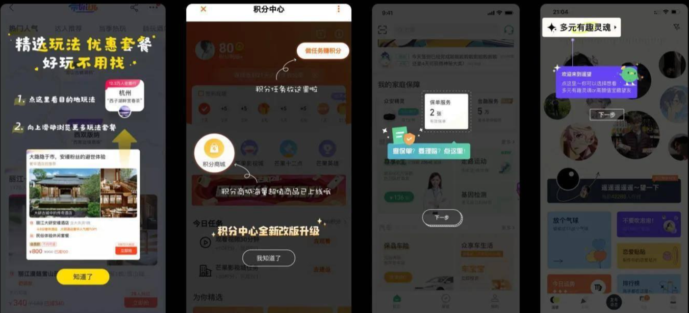 在新用户上手时,如果用户没有强烈的使用诉求,极有可能在初步尝试后就因为畏难而草率弃用。因而很多软件设置了上手指南,以提示弹窗配合灰度一步步引导的方式,带领用户预操作一番或者认识最常用功能,降低认知负荷,提升产品有效性。