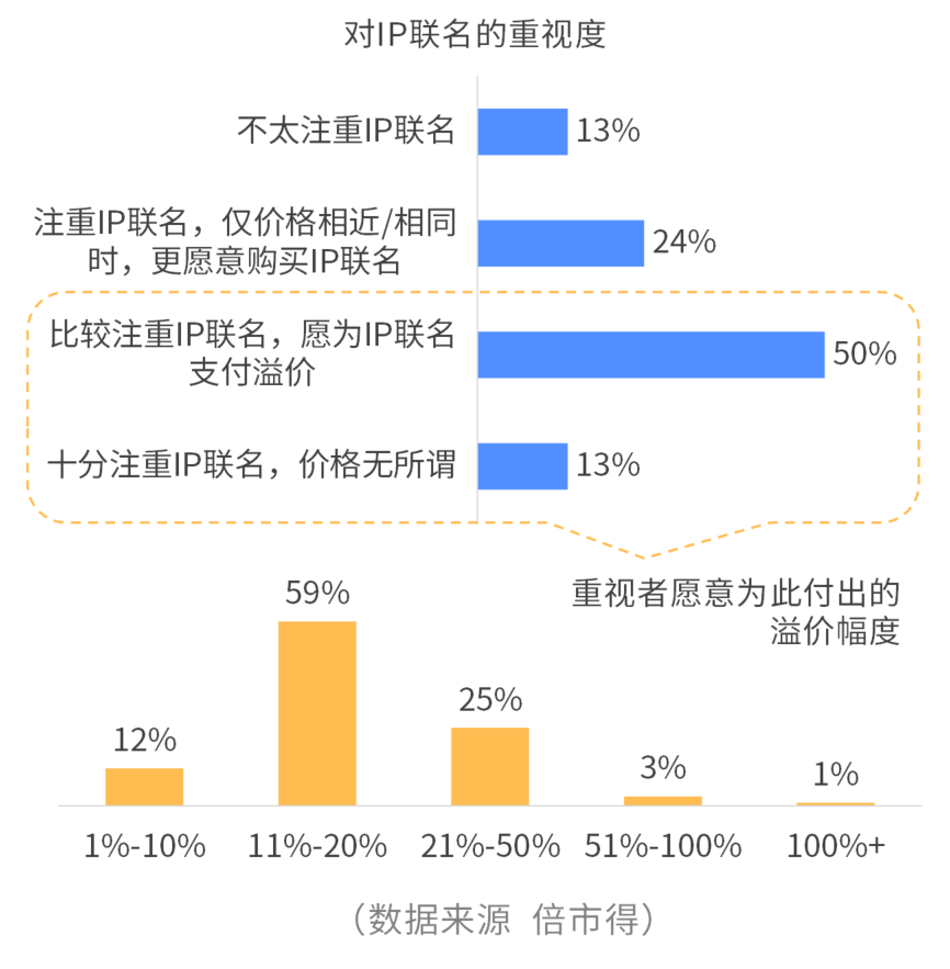 IP给产品带来的,不仅是持续购买的动力,还能够在一定程度上提升产品的溢价能力。调研数据显示,有63%的受访者很重视IP联名,并愿意为此多花一些钱。而在这些人中,有88%愿意接受10%以上的溢价,29%甚至愿意接受20%以上的溢价(平均可接受21%的溢价)。