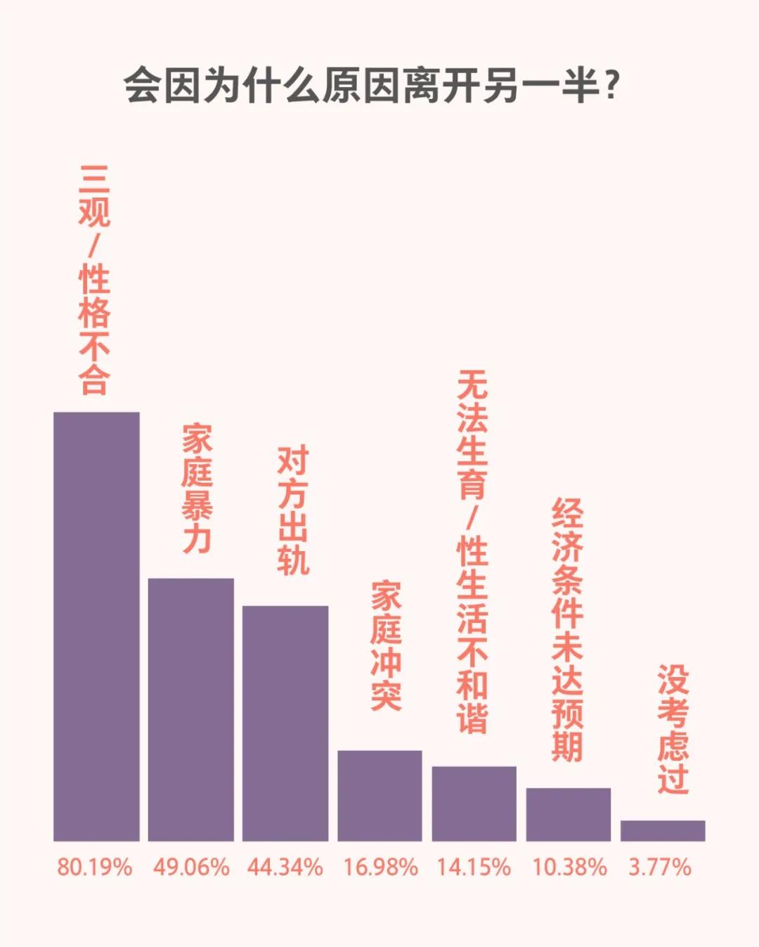 在婚姻观念上,大部分人趋于传统,选择传统婚姻(66.58%)。会让绝大多数人选择离开另一半的原因,是三观/性格不合(80.19%),选“经济条件未达预期原因”(10.38%)的只有很少的一部分。