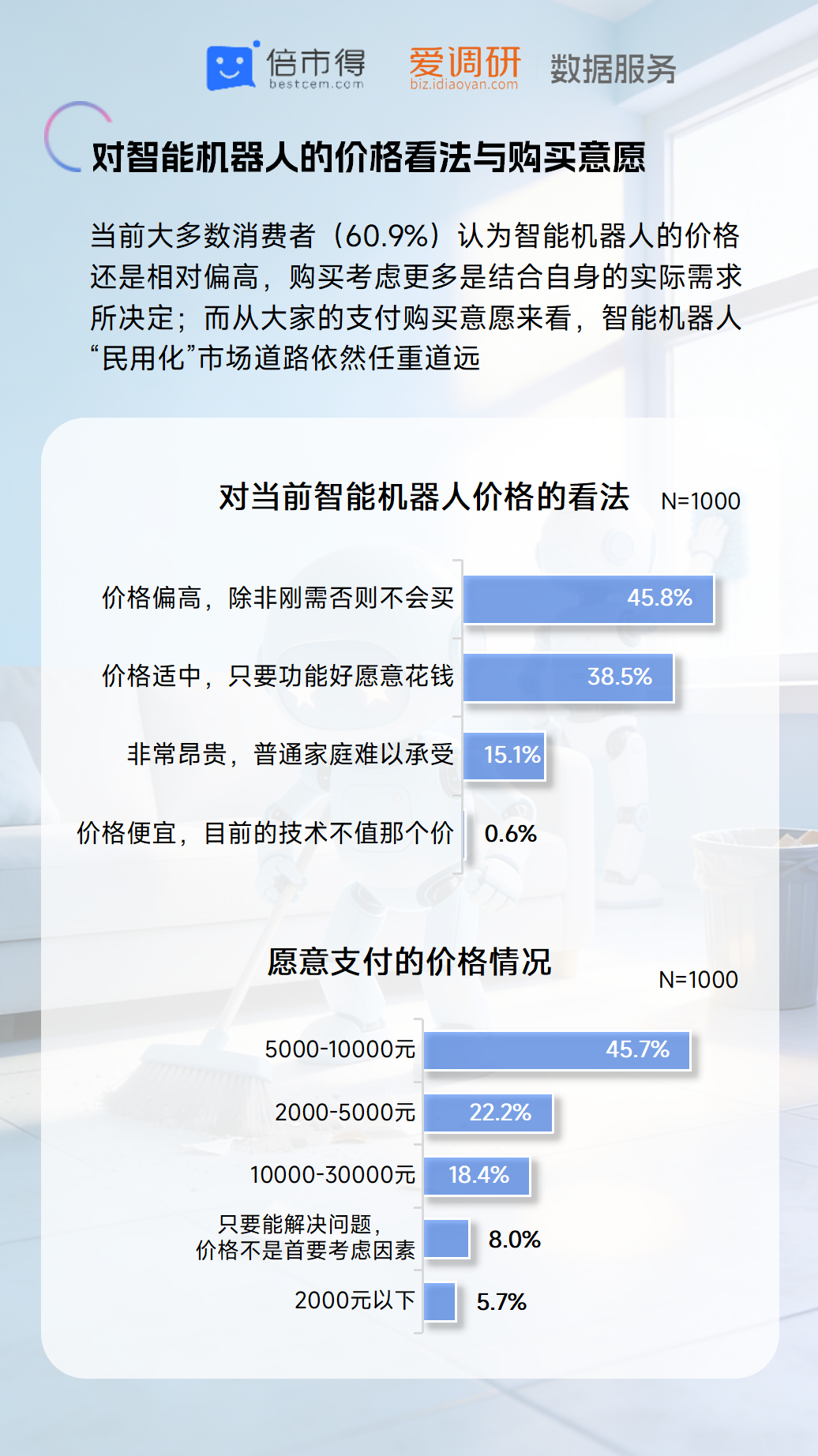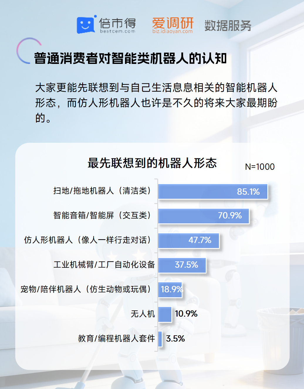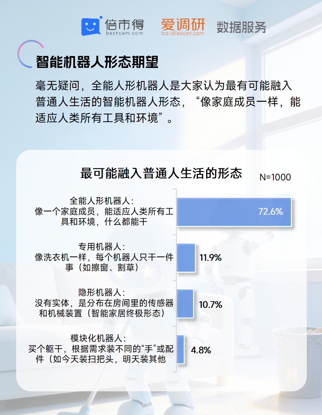 2026 年作为智能机器人产业的 “破壁之年”,具身智能技术正从实验室走向民用场景,消费者对智能机器人的需求也迎来新的变化。近日,倍市得联合爱调研数据服务发布《2026 年智能机器人热点调研报告》,通过对 1000 名中国大陆普通消费者的调研,勾勒出当前大众对智能机器人的认知、期待与顾虑,其中全能人形机器人成为消费者最期待的形态,家庭全场景服务需求呈现爆发式倾向。