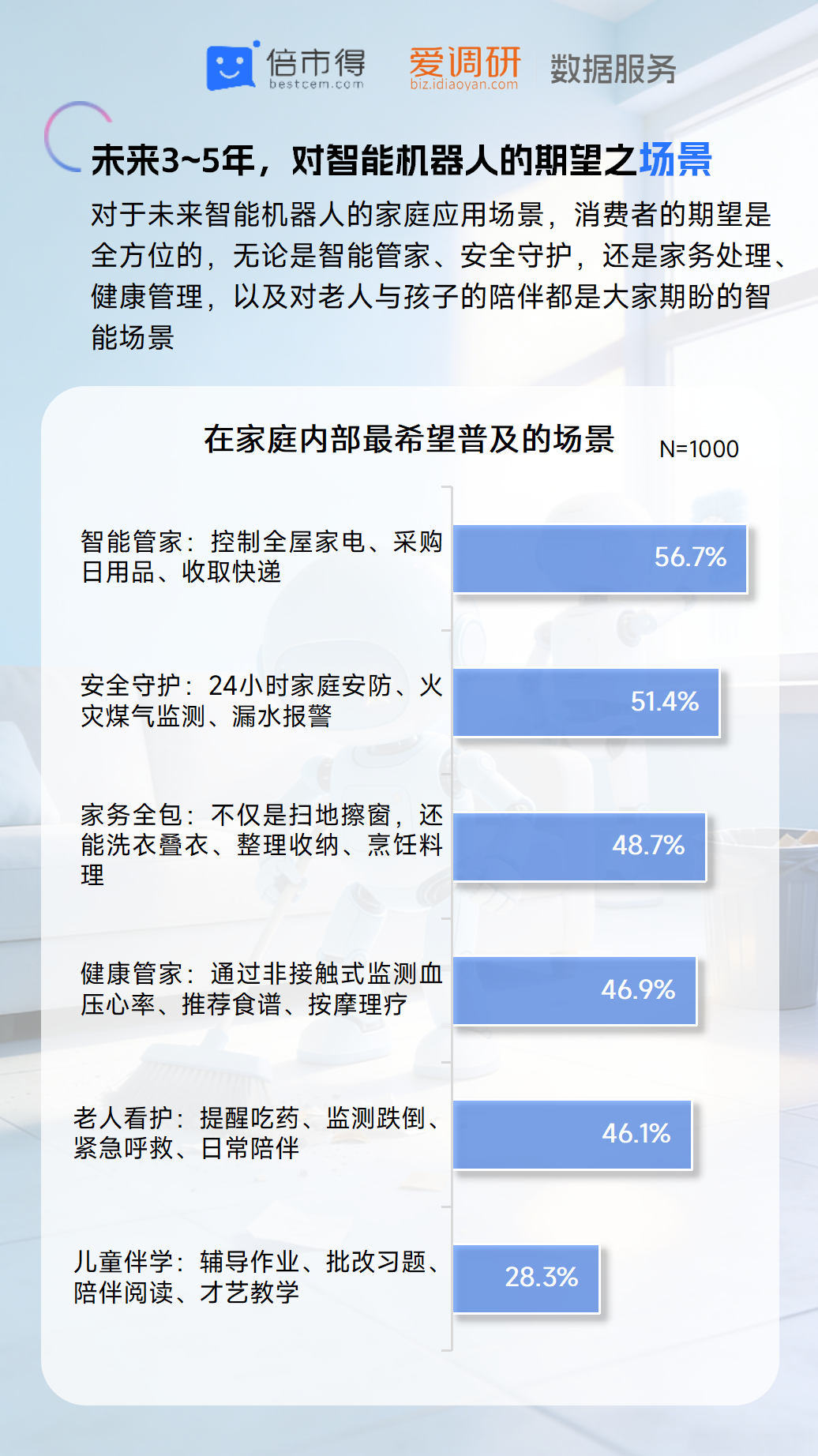 家庭场景成为消费者对智能机器人应用的核心期待领域,据倍市得调研数据显示,56.7% 的受访者希望普及智能管家场景,实现全屋家电控制、日用品采购等功能;51.4% 期待安全守护功能,涵盖 24 小时安防、煤气监测等;家务全包、健康管理、老人看护等场景的期待占比也均超 46%。