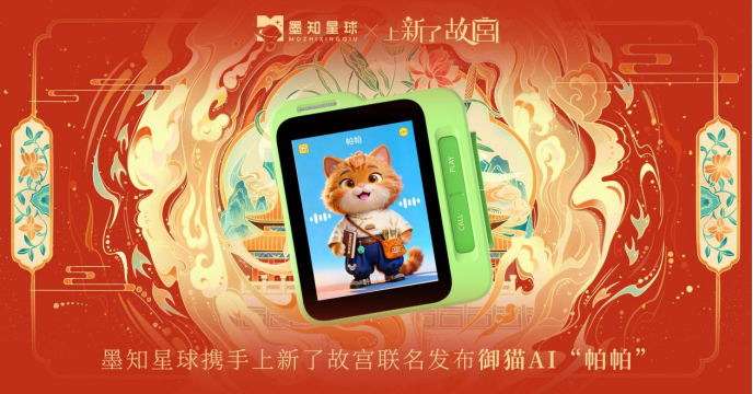 2026年1月,教育科技品牌墨知星球与“上新了故宫”IP达成深度合作,双方超越传统IP联名,进行系统性数字化共创,基于故宫的建筑、文物与历史,构建知识图谱并进行场景化转译,推出以故宫御猫为原型的人格化AI学习角色,并同步推出联名款AI户外学习机。这一创新恰好填补了儿童文博数字产品的体验空白。