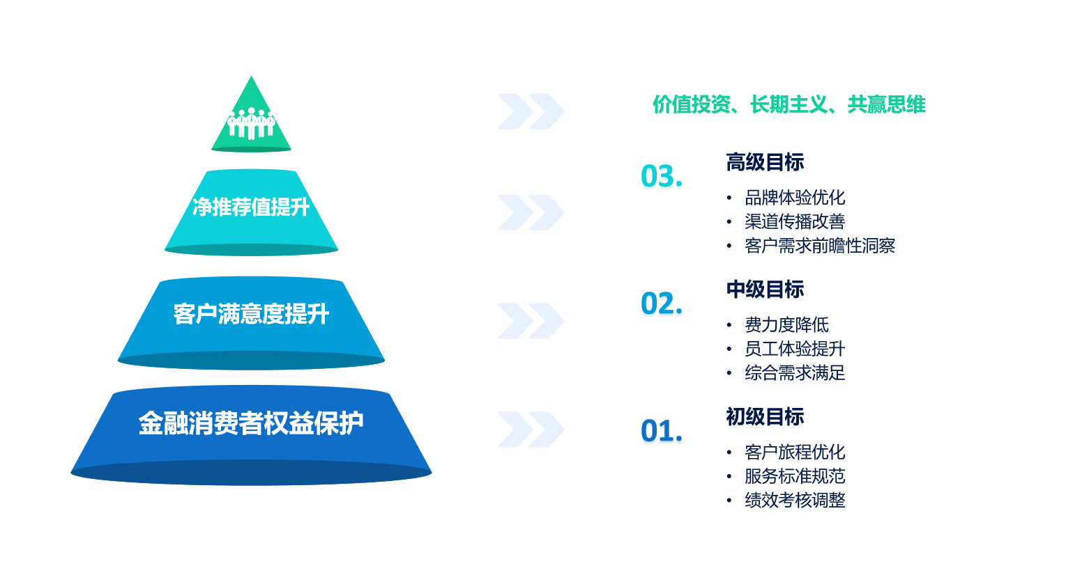 从初级目标的“降低投诉率”到高级目标的“推荐给身边的朋友,带来新增量”,这意味着金融机构需在解决痛点的基础之上,投入更多精力为客户创造惊喜,打造一流体验。