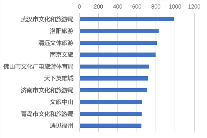 从2020年4月各城市文旅部门微信公众号的表现看,TOP10分别为:武汉市文化和旅游局、洛阳旅游、清远文体旅游、南京文旅、佛山市文化广电旅游体育局、天下英雄城(南昌市)、济南市文化和旅游局、文旅中山、青岛市文化和旅游局、遇见福州。