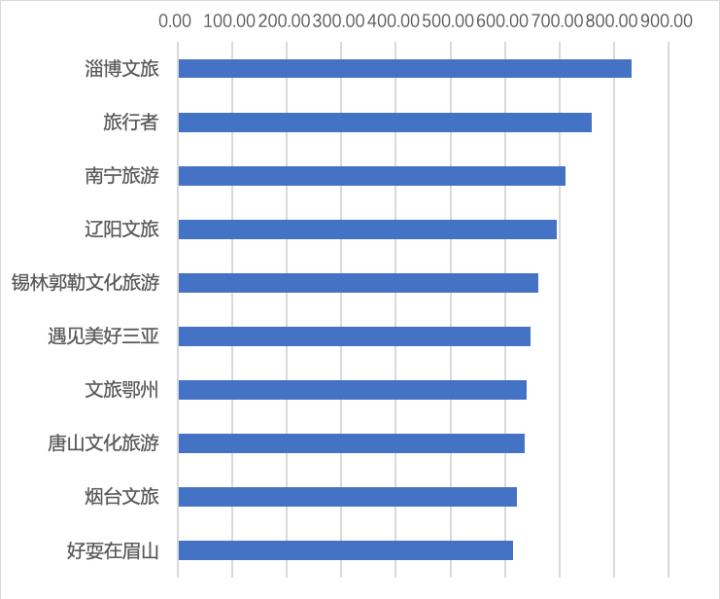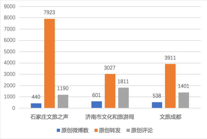 从排名居前三位的官方微博看,石家庄文旅之声虽然在原创微博数和点赞数上低于后两者,但在原创转发上遥遥领先,是后两者的两倍以上;济南市文化和旅游局微博的原创发博数在三者中数量最多,平均每天20条;文旅成都在三项指标上均居第二位。