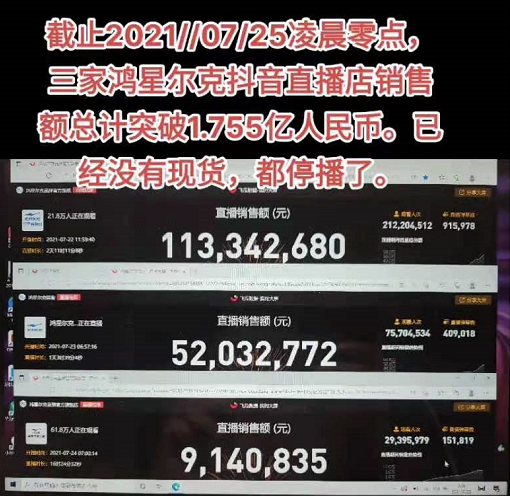 - 24日,鸿星尔克直播间累计销售额超1.7亿;