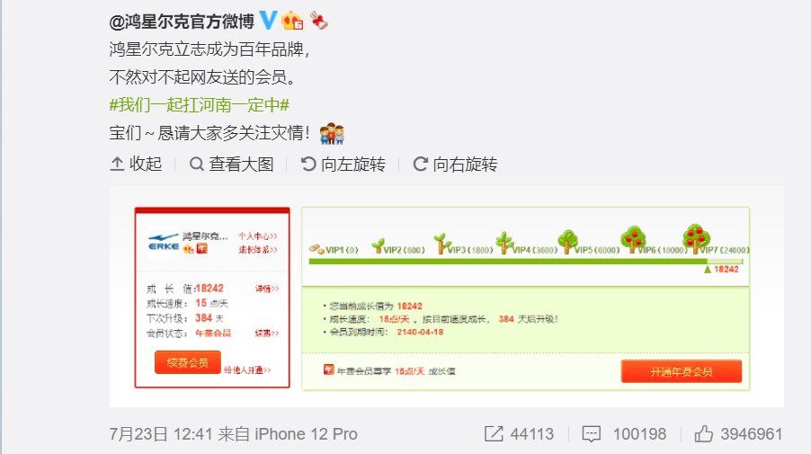 1)有人自发给鸿星尔克微博充了会员: