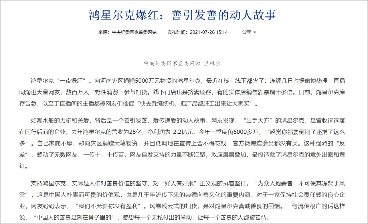 从缺乏存在感的老品牌到被全网力挺,鸿星尔克的这场意外“出圈”只用了不足48个小时。而不可复制的热闹背后,一些细节也不禁引人深思: